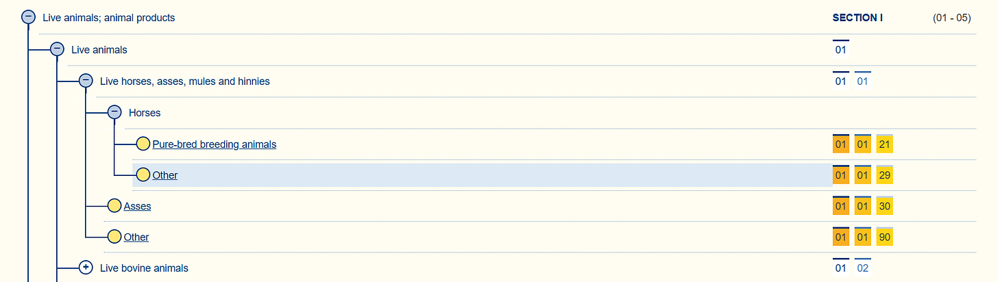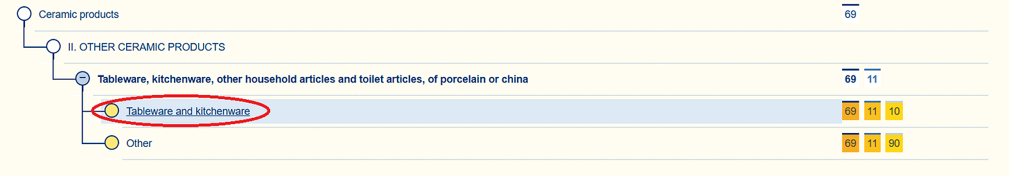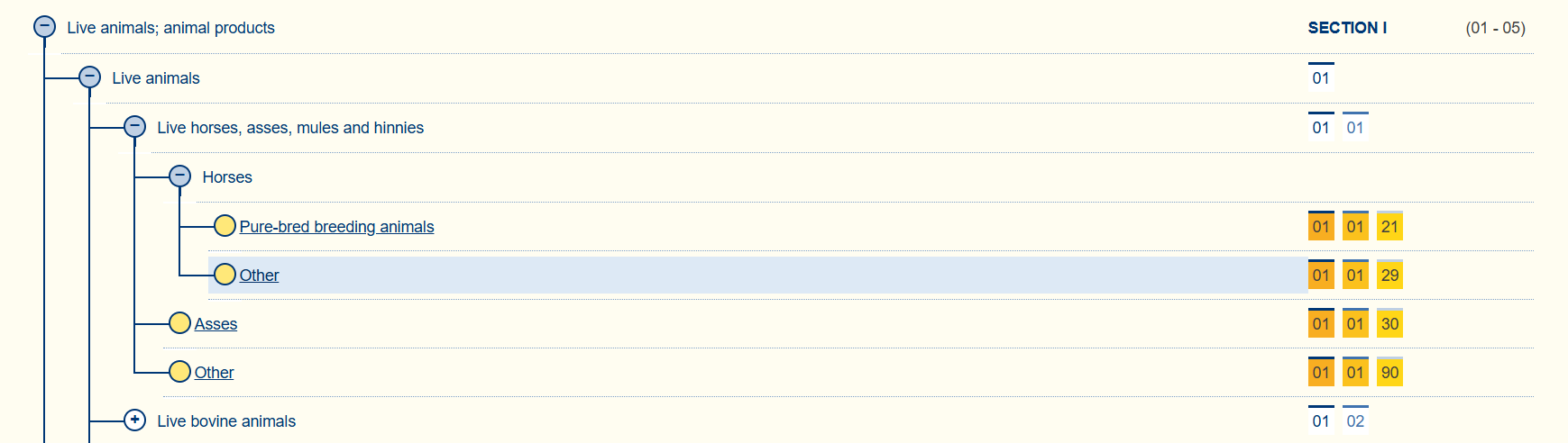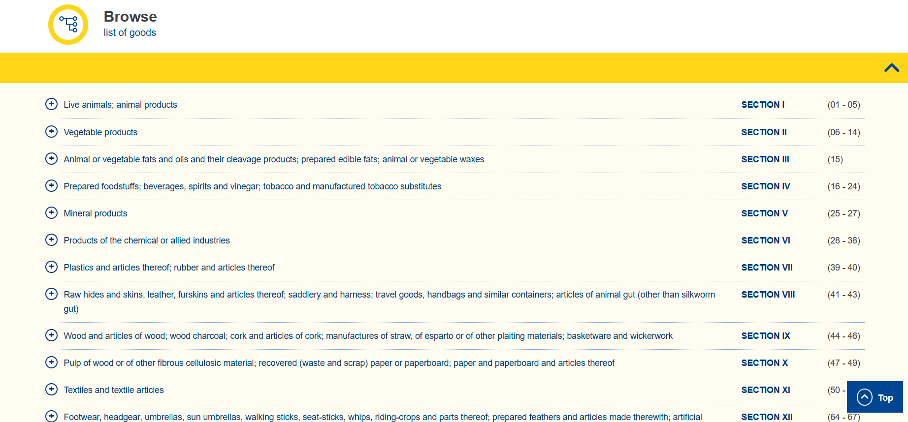 En el caso de esta búsqueda tendremos todas las secciones de productos subdivididas en: Sección, Código HS, Nomenclatura Combinada y el código TARIC.