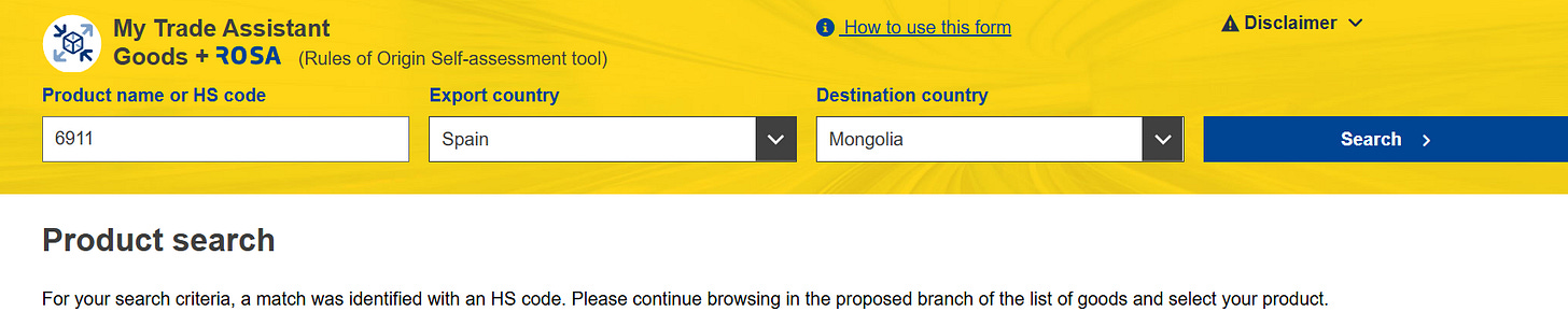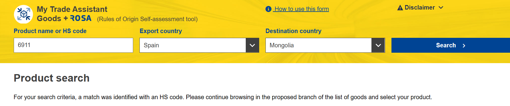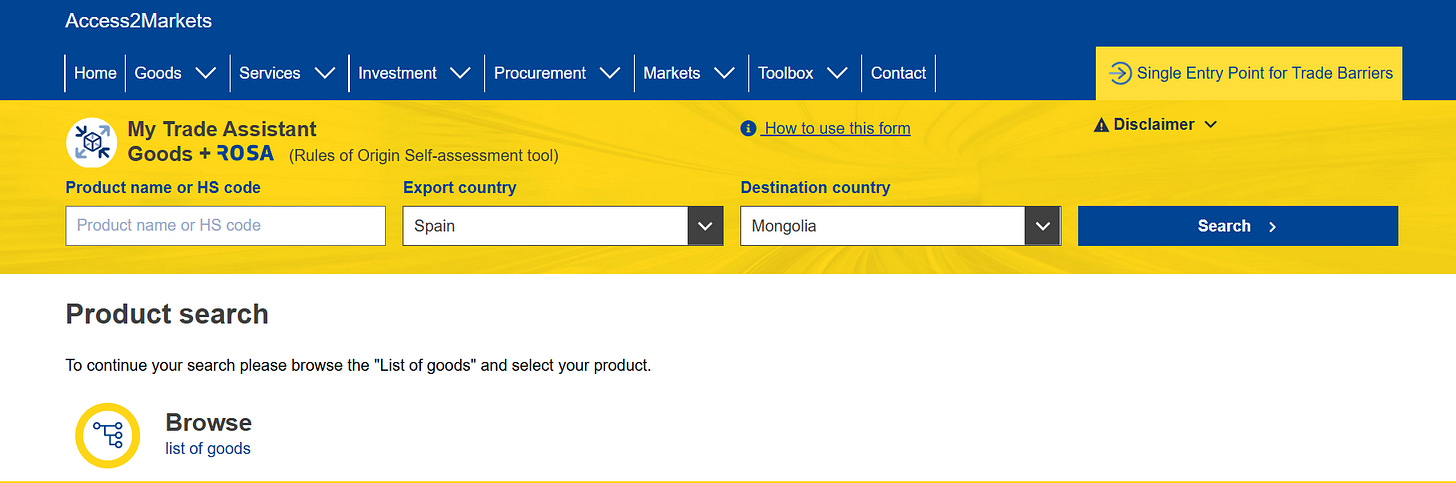 En la primera caja de información empezando desde la izquierda tenemos que poner el nombre del producto o el código arancelario (con el HS basta para que nos de un listado de productos).