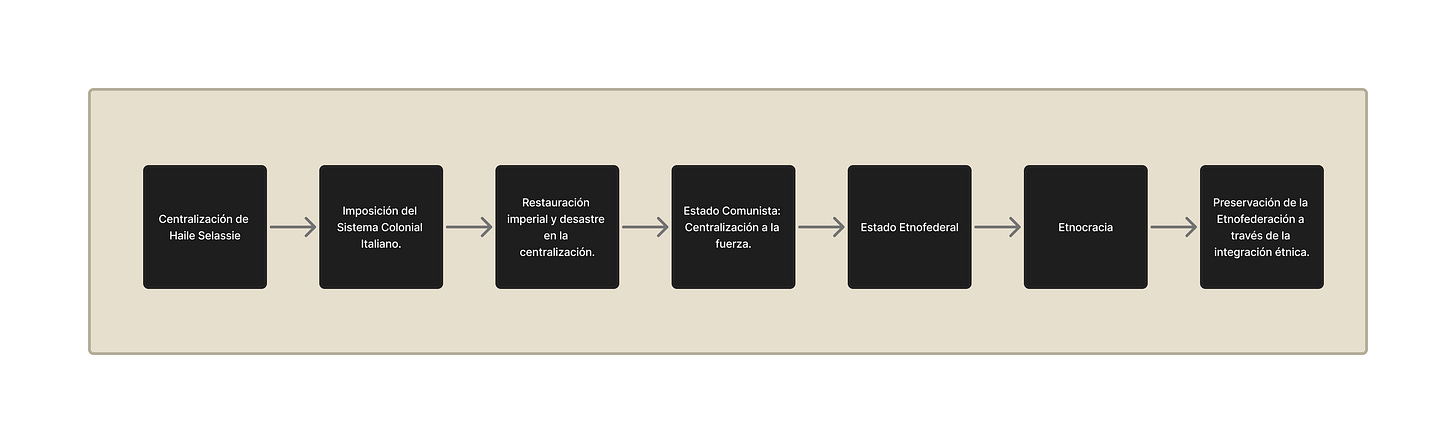 A lo largo de la historia etíope, partiendo desde el Reino de Aksum (siglo I a.C al V d.C), que es la organización política más antigua que tiene registros suficientes para empezar nuestro análisis, hasta la Guerra Civil del Tigray de 2018, la organización política de los etíopes ha sido diversa a lo largo de los siglos, pero todas apuntan a una forma en concreto de organización: la federación.