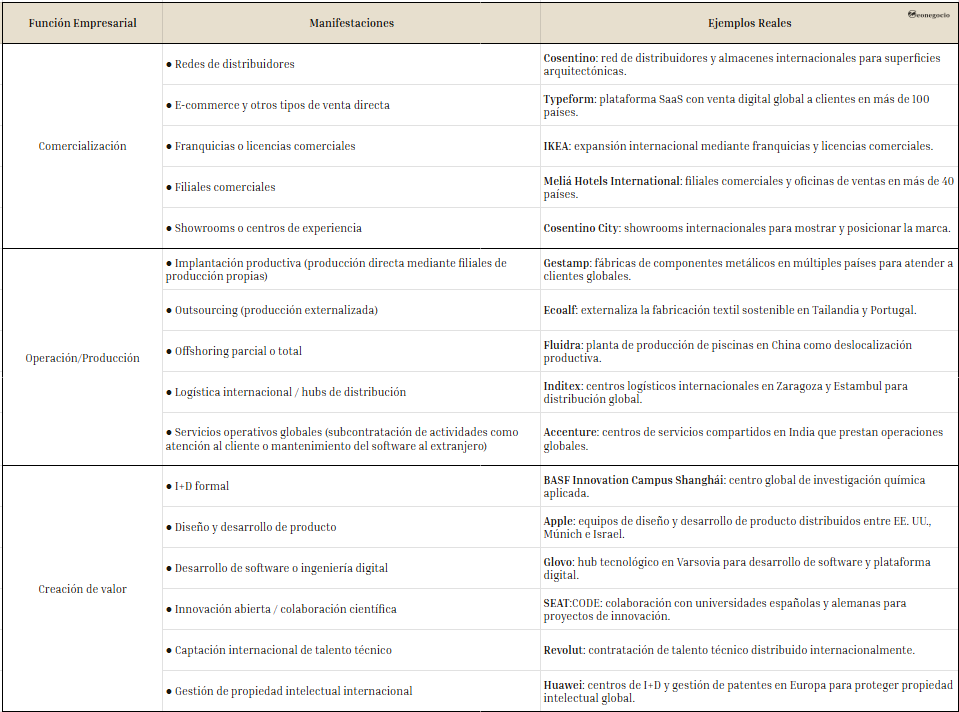 A continuación se presenta una tabla con algunas de las posibles manifestaciones de internacionalización de las Funciones Empresariales mencionadas.