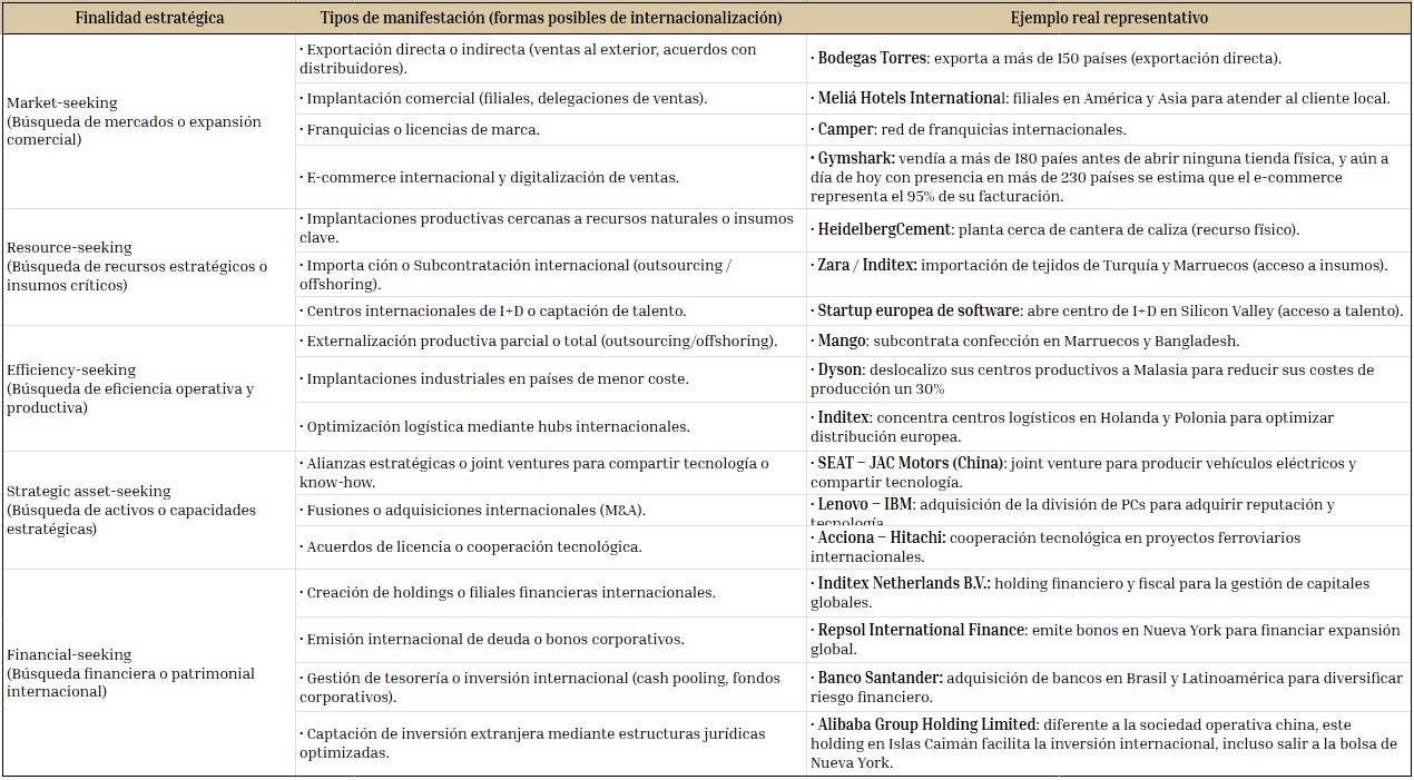 En resumen: cuando se decide llevar a cabo una operación en mercados exteriores en lugar de en el propio puede ser porque se busque llegar a más mercado (Market-seeking), acceder a recursos clave que son más caros o inaccesibles en el mercado de origen (Resource-seeking), aumentar la eficiencia (producir más con menos costes) (Efficiency-seeking), acceder a activos estratégicos clave como marca, tecnología o know-how (Strategic Asset-seeking) y acceder a herramientas financieras así como optimizar el movimiento de capitales (Financial-seeking).